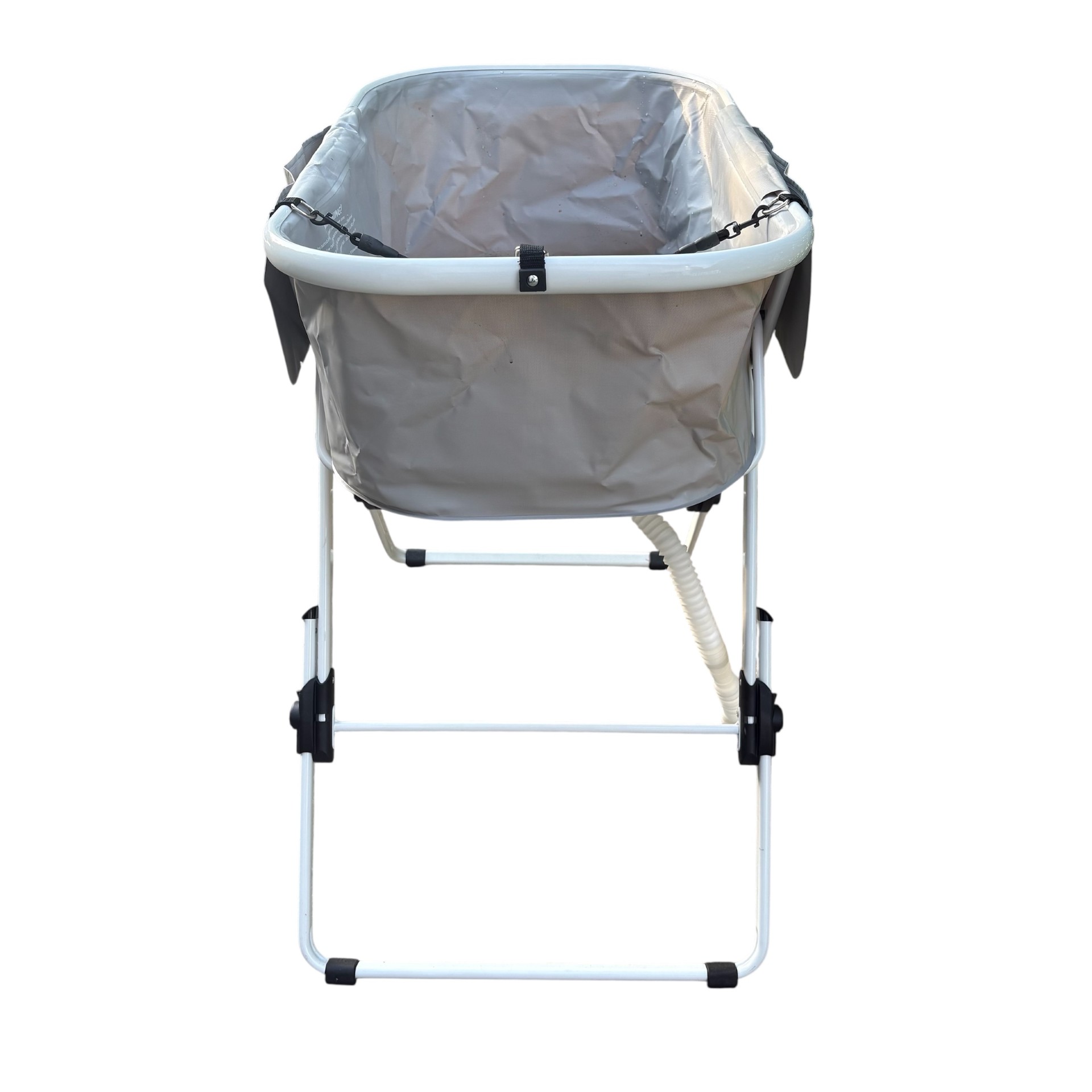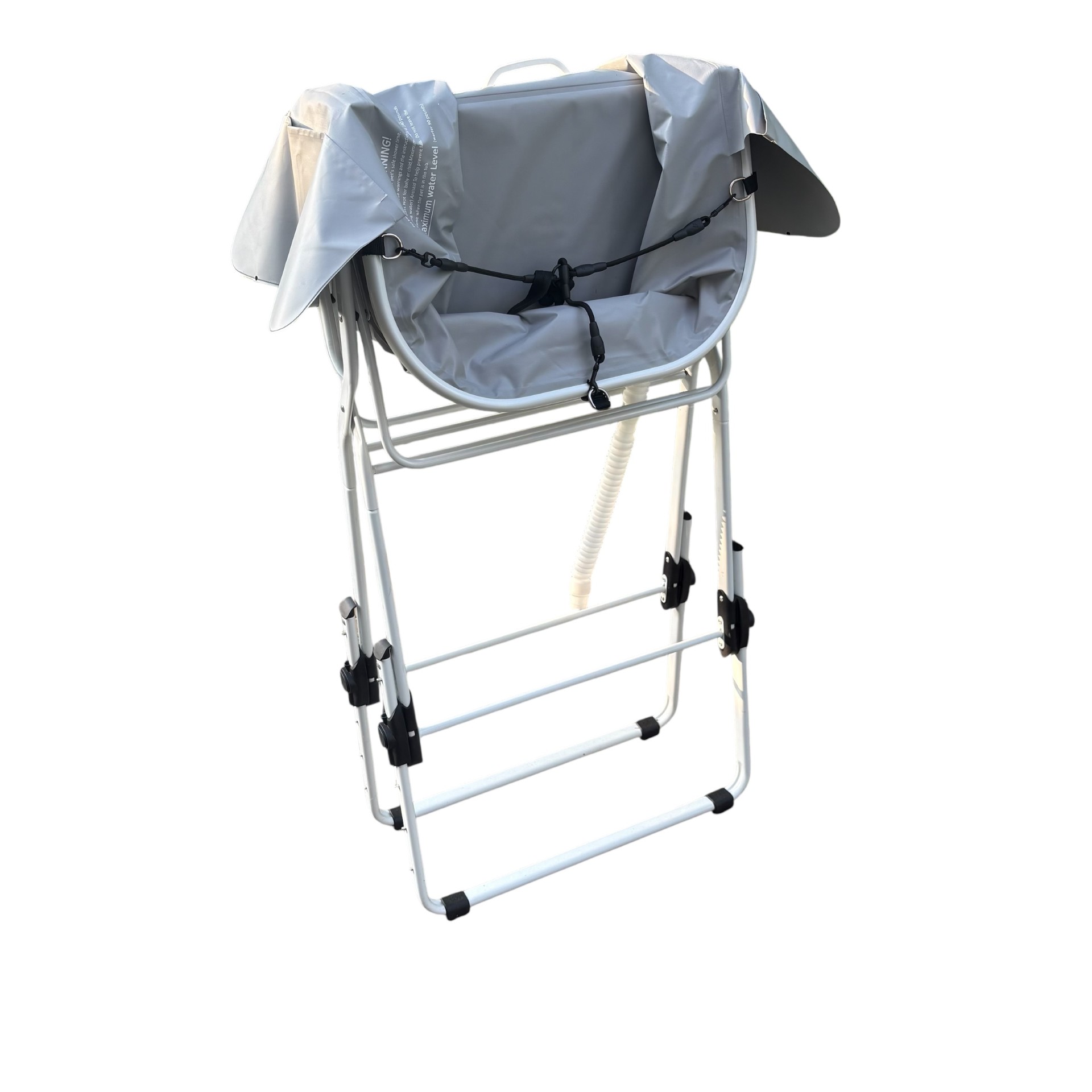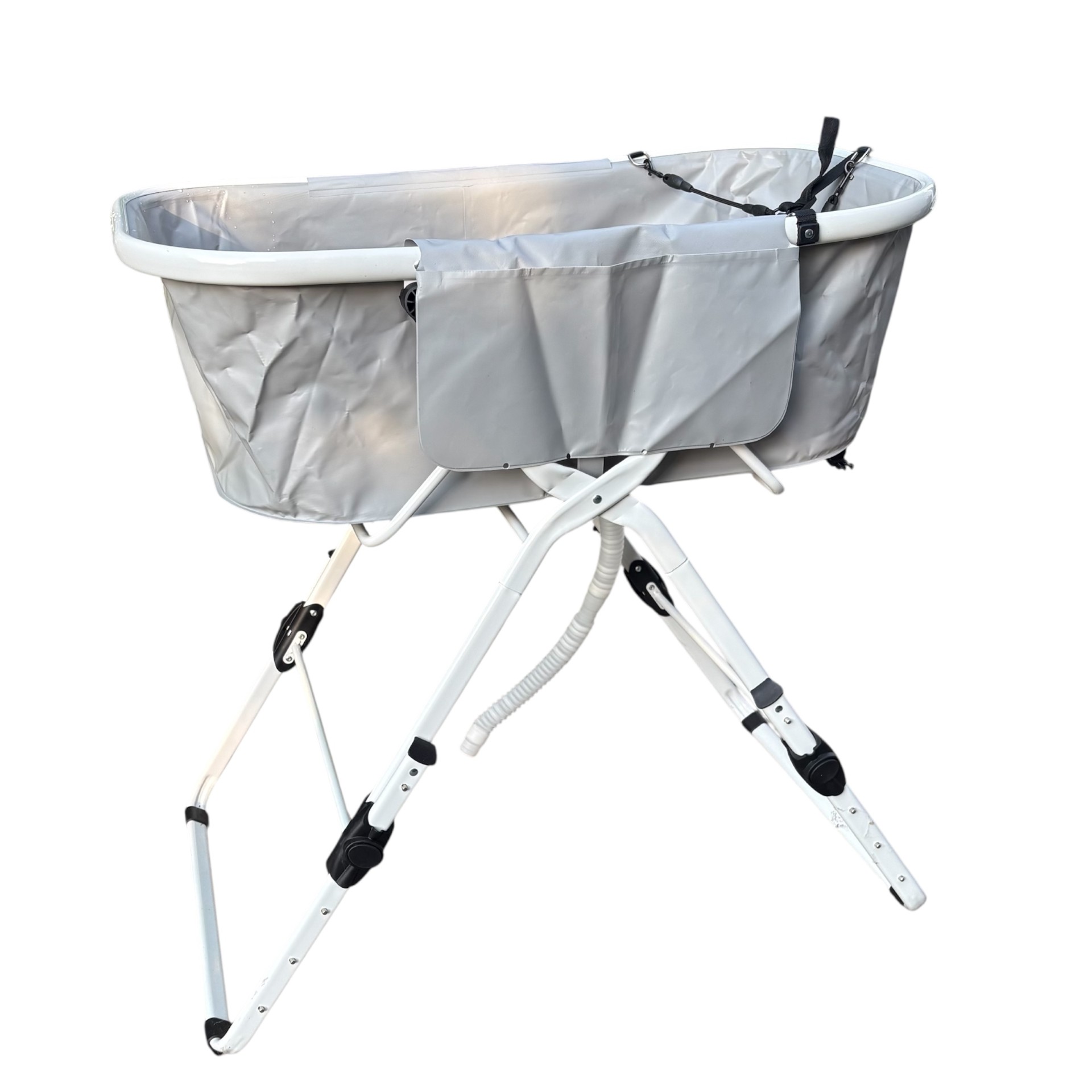 Slut med rygsmerter under vaskning af din hund. Dette folde og justerbare badekar gør badning og pleje behageligt for din ryg og knæ ved at placere badekarret i den perfekte højde som passer til dig. Badekarret kan indstilles i 5 højder. Badekarret har sidelommer til opbevaring af shampoo og andre bade og plejeartikler inden for rækkevidde.