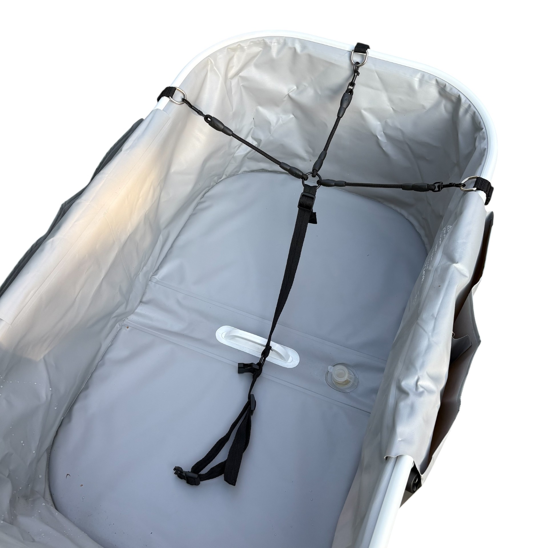 Vasken er fremstillet i kvalitet marinekvalitets pvc, som er robust og meget nem at rengøre og modstandsdygtig over for slid fra poter og kløer. Rammen/kant er lavet af rustfrie aluminiumsrør og vejer mindre end 5.5 kg i total, men understøtter mere end 60-70 kg (inklusive vand) og forbliver stabil og skridsikker under badning og pleje.