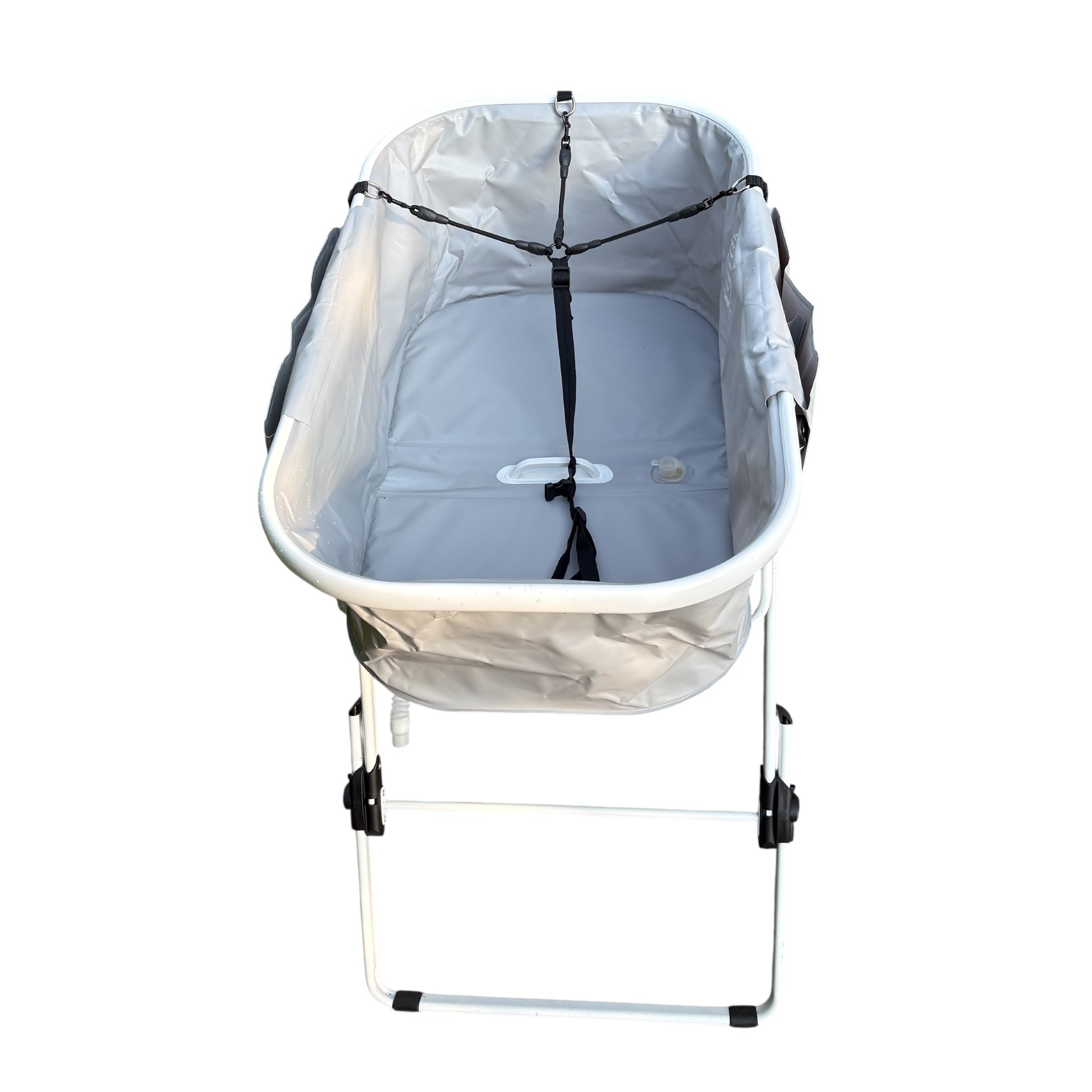 Træk i håndtaget på midten af badekarret for at folde det fra 89 cm til kun 15 cm i bredden for nem opbevaring. Badekarrets aluminiumsben kan nemt fjernes, for at spare endnu mere plads under opbevaring og transport.